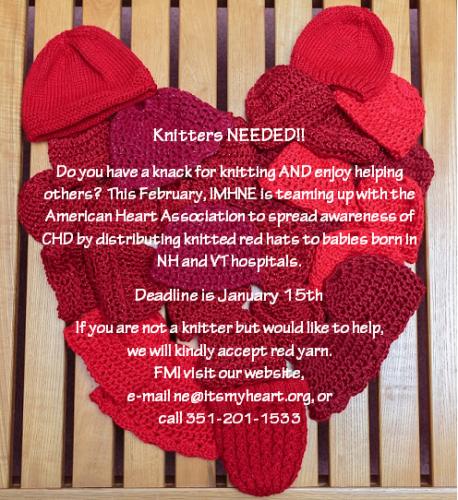 It's My Heart New England is teaming up with the American Heart Association to spread CHD Awareness by distributing red hats to babies in NH and VT hospitals. If you knit or crochet, or know someone who does, please help us get to our goal of 900 hats! All hats must be submitted by January 15 in order to be laundered for February delivery. If you don't knit or crochet, but still want to be involved, we will gladly accept donations of red yarn. E-mail us at ne@itsmyheart.org for more information.