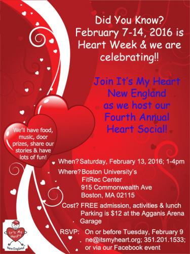 It's My Heart New England will host our 5th Annual Heart Social at Boston University's Fitness and Recreation Center on Saturday, February 13 from 1-4pm. Join us for some great food, fun conversation, and crafts and activities for the kids. Admission to the social is free, but parking is $12.